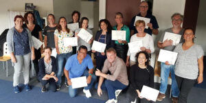 Na de lunch gingen we verder en kregen we nieuwe technieken uitgelegd. En omdat we met een oneven aantal deelnemers waren mochten Monique en Wendy afwisselend als een soort crash test mummies optreden. Fijn voor hun en fijn voor ons want als ervaren stoelmasseurs konden zij ons goede feedback geven. Aan het eind van de middag kregen we allemaal nog de kans om de technieken die we gedurende de dag geleerd hadden in één sessie uit te voeren.