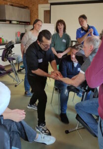 Na de lunch gingen wij aan de slag met het in tweetallen uitvoeren van klassieke handmassagegrepen en accupressuurtechnieken op de onderarm en handen. Het was de bedoeling dat we dat met olie zouden doen, maar hiervan waren de aanwezigen vooraf niet op de hoogte gesteld. Maar geen nood, want ‘alles wat je kunt eten, kun je ook op je huid smeren’, aldus Mehdi. Dus kwam er zonnebloemolie uit de keuken tevoorschijn – met een aantal theedoeken om de massagestoelen te beschermen – en konden we vlot aan de slag. Wat mij meteen opviel is hoe kundig en onderlegd Mehdi is, met een grote dosis positieve energie, humor en gevoel voor taal. Ook mooi om te zien hoe hij, aangezien Abe en ik slechtziend zijn, de massagegrepen bij ons duo aan de groep liet zien, waarna hij uitgebreid de tijd nam om de greep nogmaals uit te leggen en ons ‘mee te laten voelen’ met zijn handen.
