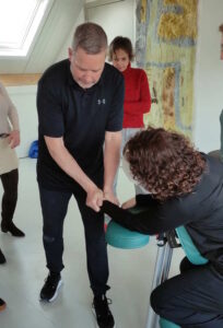 We startten de dag met een uitgebreid stuk theorie, waarbij Mehdi stil stond bij de integratieve benadering van lichaam – energie – ontspanning en hoe de Westerse geneeskunde en Oosterse leer hierin complementair aan elkaar zijn. Ook kregen we uitleg over de belangrijkste meridianen in hand en onderarm en heel praktisch: welke zijn relevant voor stress, spanning en emotionele blokkades. Het enthousiasme én de passie van Mehdi werkt hierbij erg aanstekelijk. Ook mooi om te zien hoe hij met humor en taalbruggetjes (spreekwoorden en gezegdes, zowel vanuit westerse als oosterse oorsprong) de stof écht weet over te brengen.